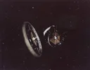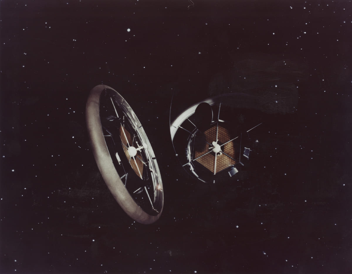 Dit is Skylab, het Amerikaanse ruimtestation dat tussen mei 1973 en maart 1974 24 weken lang bewoond is geweest. Bij de lancering ging iets mis, waardoor een schild en een set zonnepanelen afbraken. Hier zie je de laatste foto die ervan is genomen door de reparatieploeg, die het goudkleurige doek heeft geplaatst. Het ruimtestation functioneerde daarna min of meer zoals het bedoeld was, en verbrandde in 1978 in de dampkring.