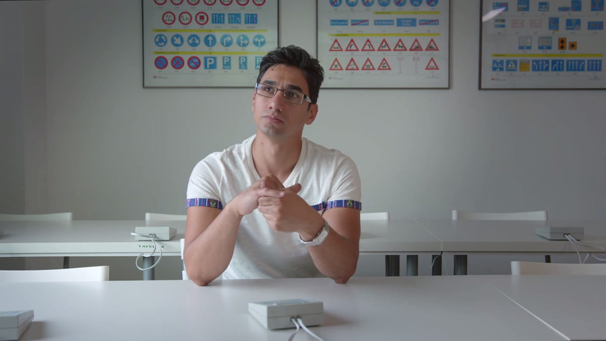 'Als wij rijexamen moeten doen in Iran, hoeft dat niet op straat. Het examen wordt afgenomen op een speciale plaats waar alle borden staan die je moet kennen en met verschillende verkeerssituaties. De examinator heeft ook een politie-uniform aan. De examinator is dus veel enger dan in Nederland omdat het op echte politie lijkt en de politie in Iran is veel strenger dan in Nederland. Ook kan je in Iran je theorie en praktijk beide op dezelfde dag halen, omdat het op dezelfde locatie wordt getoetst. Een rijbewijs halen in Iran is ook veel goedkoper, je betaalt daar ongeveer tweehonderd euro in totaal voor het lessen en de examens, terwijl dat in Nederland meestal wel tweeduizend euro is.'