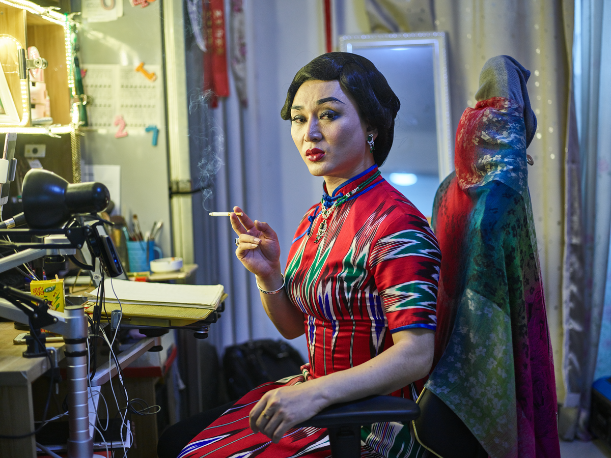 Maak in het tweede tableau kennis met livestreamer Wang Zhi, die voor zijn show de in China populaire transvrouw Jin Xing imiteert.