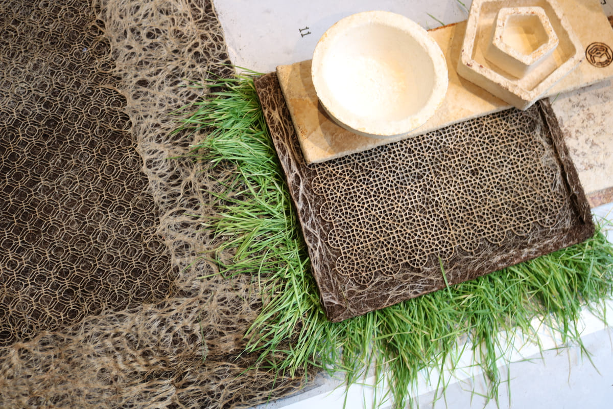 Dat laatste deed Diana Scherer, met Interwoven. Zij is altijd al gefascineerd geweest door dat wat je niet ziet, maar er wel is, verklaart ze. Ze vond gelijkgestemden in Nijmegen, alwaar biologen van de Radboud Universiteit al jaren plantenwortels bestuderen, in een speciaal ‘wortellab’. Scherer ontwierp verschillende fijnmazige, ondergrondse mallen, waardoorheen ze de slanke wortels van tarwe liet groeien. Deels beïnvloedde ze daarmee het patroon dat de witte sliertjes vormden, maar voor een deel kozen ze hun eigen weg. Het resultaat is verbluffend. De matten die ze ‘maakte’ zouden niet misstaan in een mediterraan badhuis en de meerdere lagen van wortels zorgen ervoor dat het nog stevig is ook.
