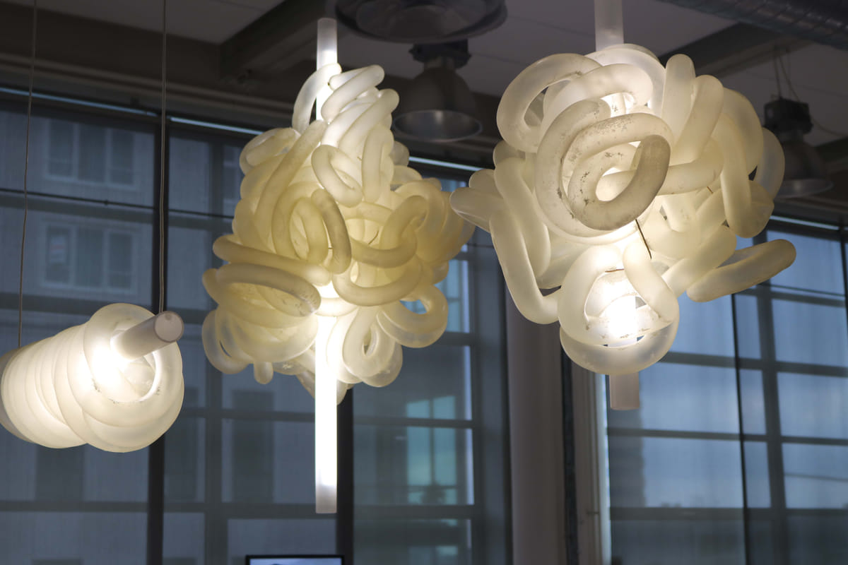 Recycling is dus een dominant thema op de expo. Al helemaal leuk is dingen maken uit geluier, zoals Dion Soethoudt doet. Hij creëerde een manier om de energie die vrijkomt als hij zich omdraait in bed om te zetten in een mooi krukje. Ook niet te missen in het recyclethema: de lamp Inside Out van Kathrine Barbo Bendixen. Gemaakt van opgeblazen koeiendarm, en toch prachtig.