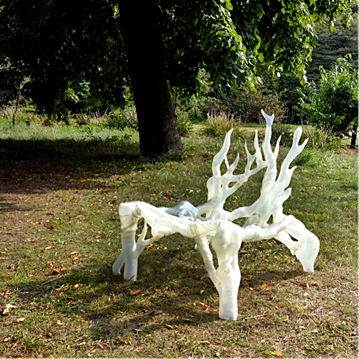 Eric Klarenbeek gebruikt mycelium, het netwerk van draden van een schimmel, in de 3D-printer. Is zijn ontwerp geprint, dan is het nog niet klaar voor gebruik, maar moet het eerst uitgroeien. Als hij volgroeid is, moet de Mushroomchair sterk genoeg zijn om een mens te dragen.
