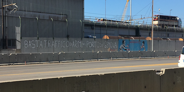 ‘Basta Traffico di Armi nel Porto di Genova’, stond er verderop langs de haven. De vakbond van havenwerkers protesteert hier al jaren tegen het verschepen van wapens naar Israël, Saoedi Arabië of Jemen.