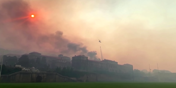 Het was 36 graden en er stond een harde zuidoostenwind, waardoor de brand in een mum van tijd de campus bereikte. Brandende dennenappels worden in zulk weer net zo gevaarlijk als molotovcocktails, die kilometers ver kunnen worden weggeschoten.