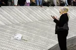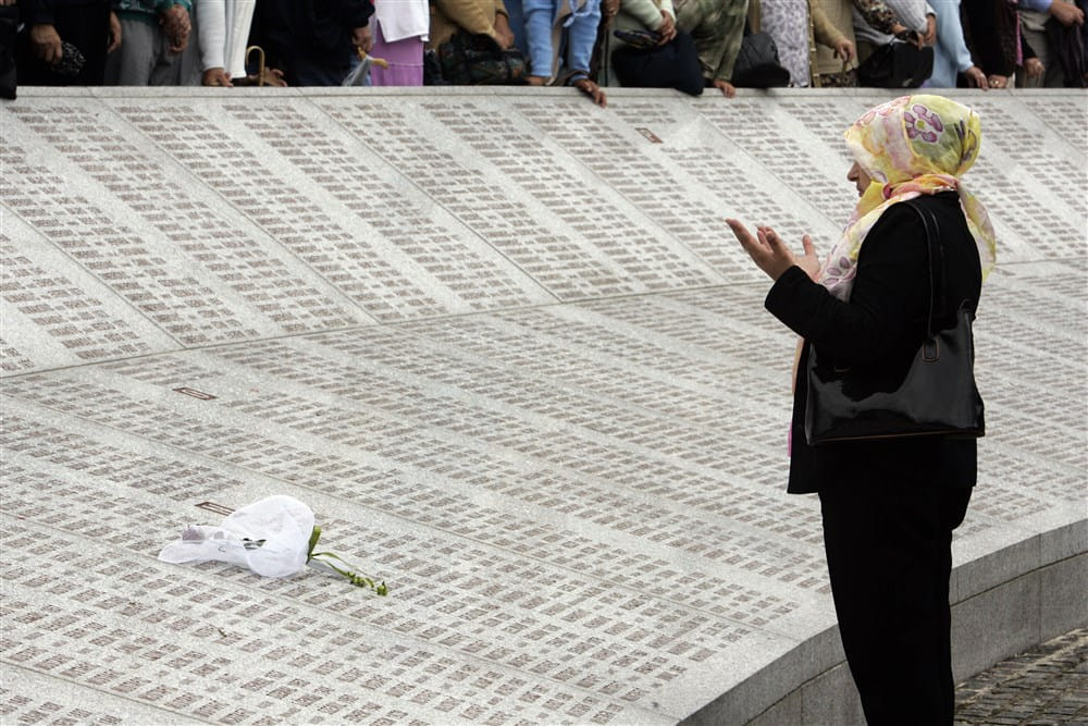 We stonden aan de voet van een marmeren gedenksteen waarop meer dan achtduizend namen van Bosnische moslims stonden gegraveerd.