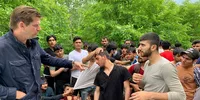 Toen de politie onze camera zag, sprong de grootste van het stel voor de camera. Terwijl hij ons om papieren vroeg, werden achter zijn rug de migranten afgevoerd. Cameraman boos: hij had het beeld niet.