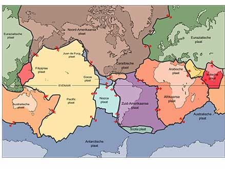 Je weet misschien dat de continenten langzaam over het aardoppervlak bewegen - zo snel als je teennagels groeien ongeveer. Dat komt doordat ze op verschillende aardplaten liggen. Er zijn zes grote platen, en nog wat kleinere. Zijn dat dan stukken van de korst? Nee, ze reiken veel dieper. Aardplaten zijn tot honderd kilometer dik, en omvatten dus ook een deel van de mantel. Waar ze botsen, ontstaan gebergten en waar ze uit elkaar drijven, komt vloeibaar geworden gesteente omhoog en heb je vulkanen.