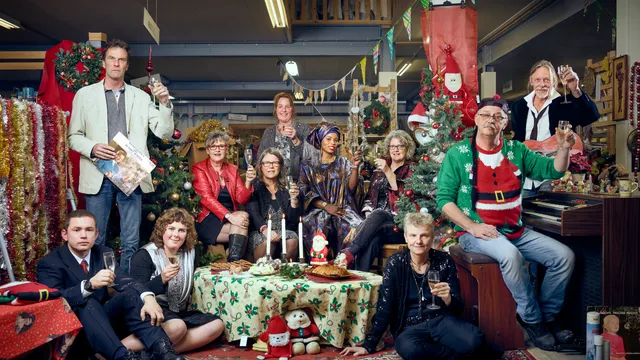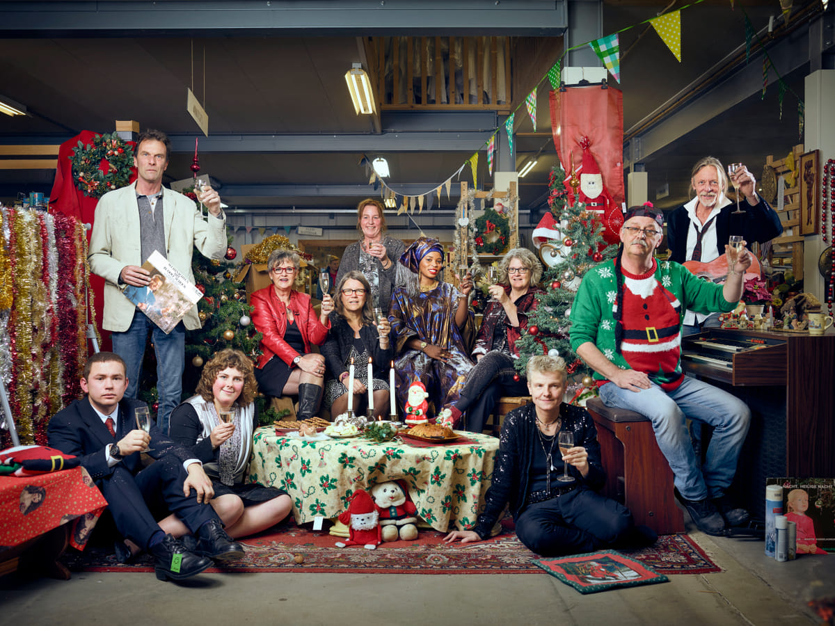 Terwijl de fotograaf zijn spullen uit de auto haalt en de lampen opstelt, zoekt Beate in de winkel naar extra decoratiemateriaal voor de finishing touch. Twee kerstelpees maken het plaatje af. Dan krijgen de figuranten een plekje aangewezen en worden de alcoholvrije bubbels ontkurkt.