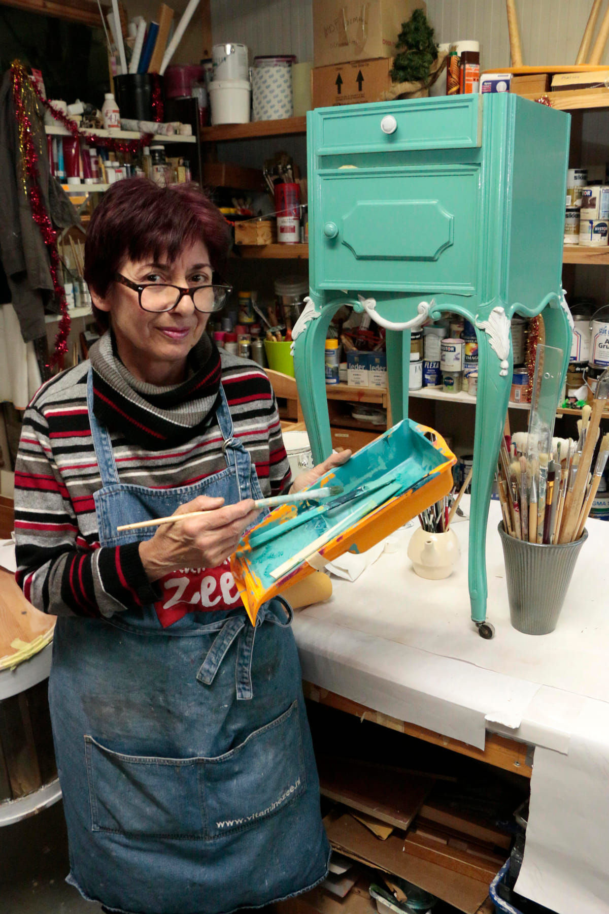 Karina is Armeense, was architect in de voormalige SU vluchtte naar Nederland. Nu maakt ze in Steenwijk van oude meubelen kinder stoeltjes en tafeltjes. Altijd volop versierd met bloemen, zeegezichten en landschappen. De winkel is haar nieuwe huis, zegt ze.