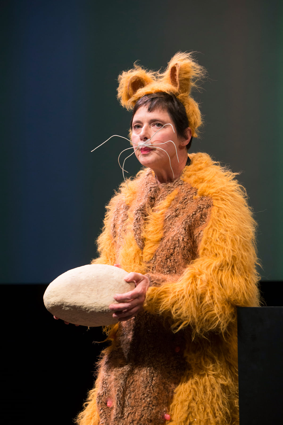 Staand achter een katheder laat de beroemde actrice uit Wild at Heart en Blue Velvet, ook bekend als het ‘gezicht’ van Lancôme, een andere kant van zichzelf zien. Met groot komisch talent en simpele middelen – dierenkostuums waar ze zich snel in en uitwurmt en wat attributen – voert ze ons mee in een moderne variant van de slapstick over de vreemde paringsrituelen van alles wat rent, kruipt, vliegt en zwemt.
