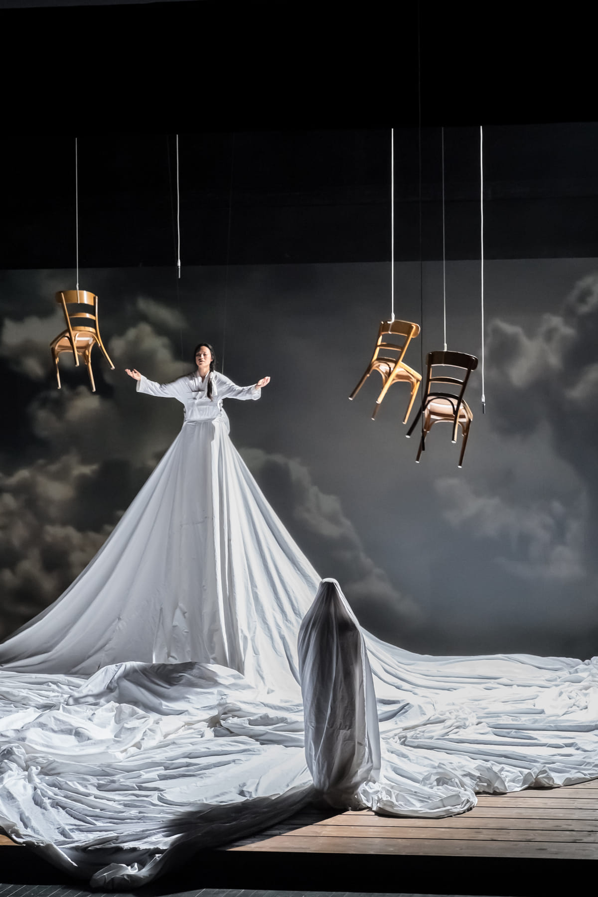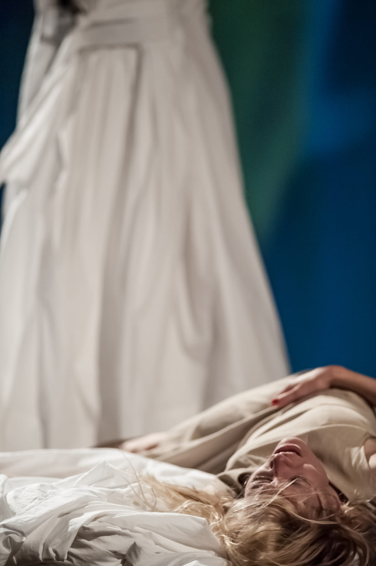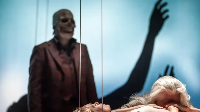 Het stuk begint met een vrolijk dansje van personage Patrice (Please up the sound!), presentator van Speak in the Night bij Radio Quebec, dat nou niet meteen aan een danse macabre doet denken, maar gaandeweg ontvouwt die grimmige dodendans (niemand in het ensemble ontkomt eraan) zich wel degelijk en in alle heftigheid. Un jour verwijst niet naar een concrete gebeurtenis. Het is een theatraal vormgegeven onderzoek: enerzijds naar de omgang met de dood en de doden door de tijd heen en in verschillende culturen, anderzijds naar de wisselwerking tussen die twee groepen, de levenden en de doden, die elkaar maar niet met rust (willen) laten. Geen ‘heropvoering’ dus, wel een aaneenschakeling van ensceneringen, ‘lange beelden’ noemt Furlan die aan de film en installatiekunst ontleende krachtige en associatieve taferelen, waarin de iconografie van de dood herkenbaar aanwezig is, compleet met spookbeelden.