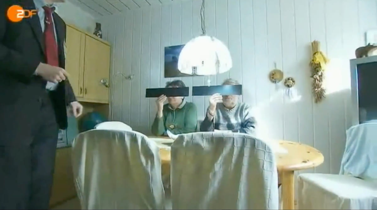 Voor het programma die Heute Show, maakte comedian Martin Sonneborn een item over Google Home View. Sonneborn belt aan bij elke deur die hij ziet in een klein Duits plaatsje zoals Molfsee en vraagt of hij foto's van alles in het huis mag maken tot in de slaapkamer aan toe. Hierboven zie je een stel waar hij op bezoek was. Een foto voordat hun ogen 'geblurd' werden en erna. Net misdadigers. Het item steekt de draak met de gegronde Duitse angst voor een inbreuk op de persoonlijke privacy die Google Street View kan zijn.