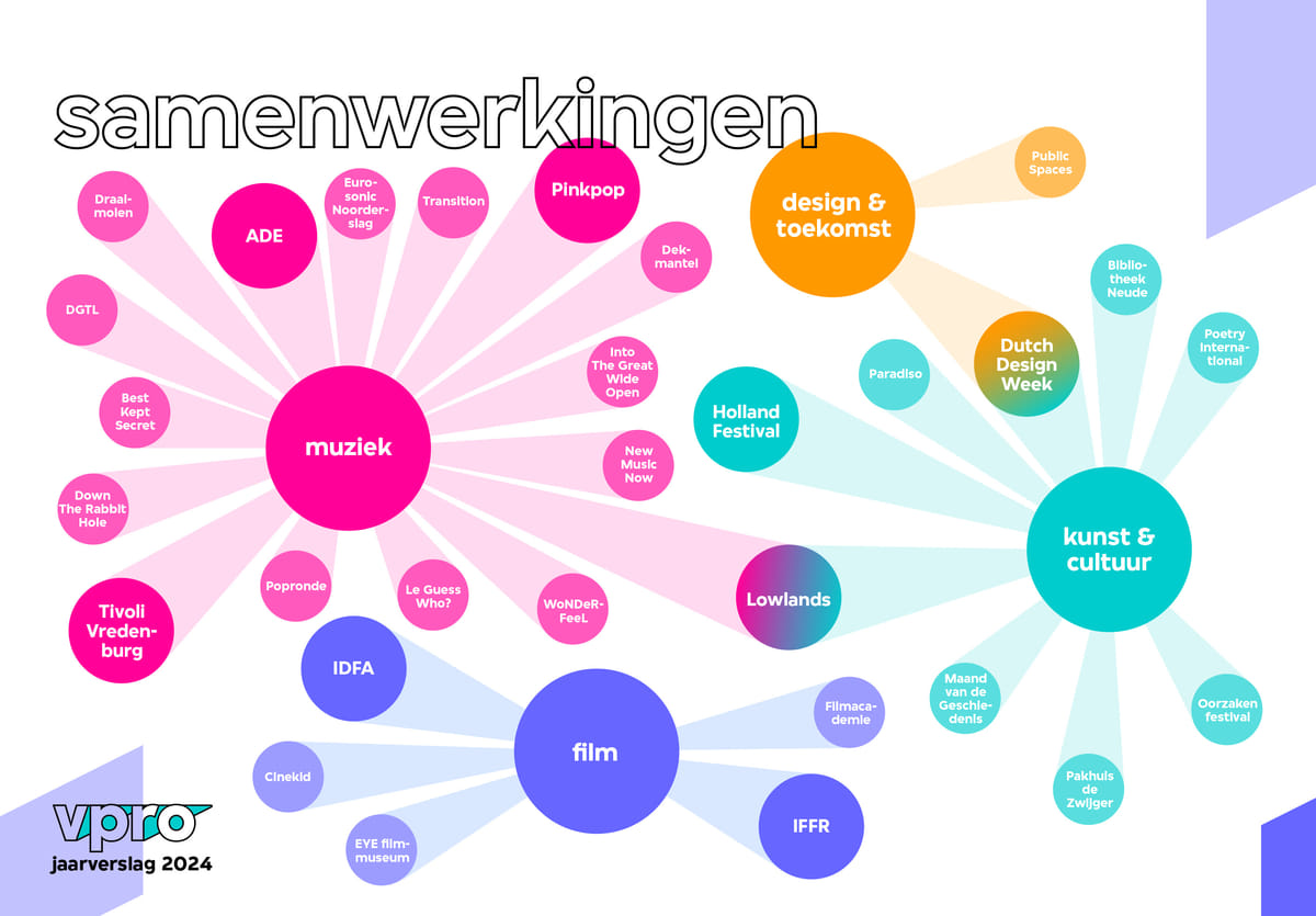 De VPRO beschikt over een breed netwerk van organisaties binnen de creatieve sector. Dit stelt ons in staat om ons media-aanbod te verrijken, het creatieve potentieel van de sector te versterken en samen met onze partners een jonger en diverser publiek te bereiken.