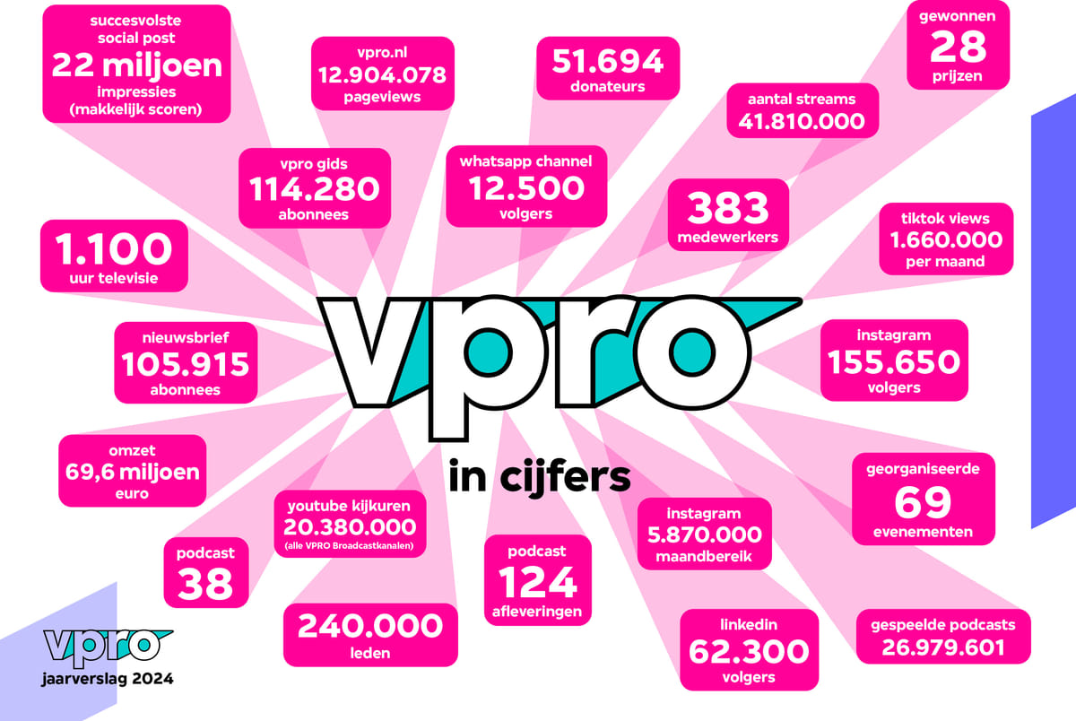 2024 was een roerig jaar waarin wereldwijd de geopolitieke verhoudingen in rap tempo veranderden en in Nederland radicaal-rechtse politici, die al langer aan de poten van het omroepbestel zaagden, vrij spel leken te krijgen. Intern werden we geraakt door het overlijden van onze geliefde directeur Lennart van der Meulen. Ondertussen richtte de VPRO zich met alle energie op de toekomst.