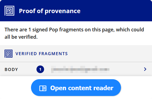Wanneer je deze pagina in Firefox opent of ververst zie je rechtsboven een melding dat er één Proof of provenance-fragment gevonden is.