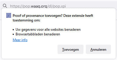 Om de extensie te installeren klik je op deze link. Je krijgt hierna de melding 'Proof of provenance toevoegen?'. Klik op 'Toevoegen'.