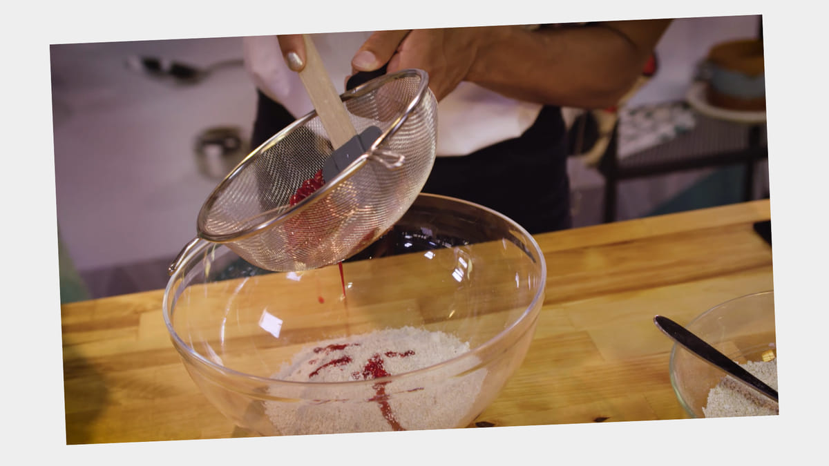 Tip: gebruik een pannenlikker om de frambozen en bessen door de zeef te drukken!