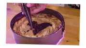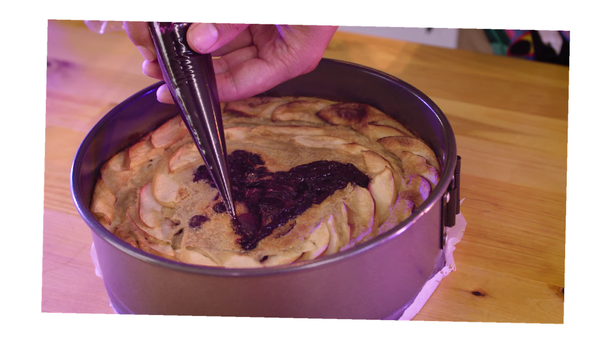 Haal de cake na 30 minuten uit de oven en laat hem even afkoelen. Tijd voor de finishing touch! Doe de coulis in een spuitzak en teken mooie vormpjes op de taart, zoals bolletjes of hartjes. Oui, oui, la Clafoutis est fini!