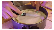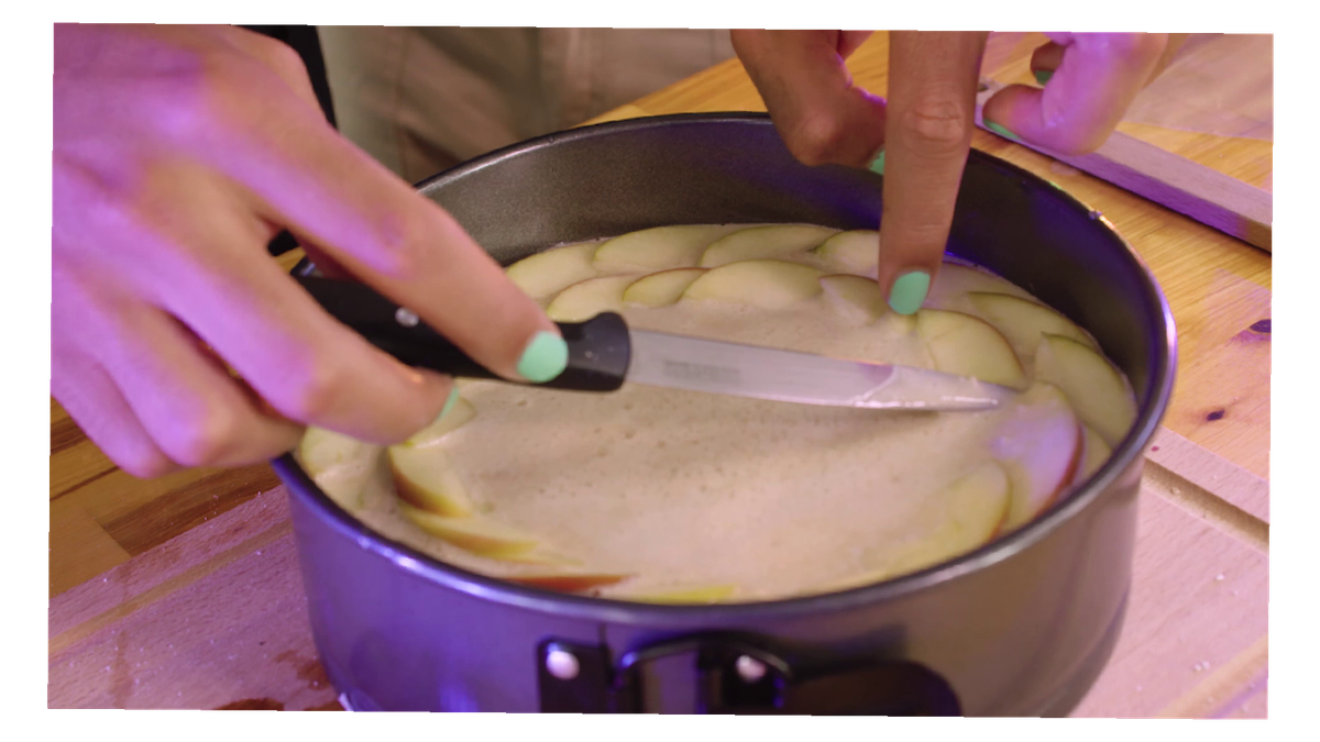 Verwarm de oven voor op 180º graden. Gebruik een bakvorm met een losse onderkant. Leg een vel bakpapier in de bakvorm en knip deze op maat. Blend de havermout met een staafmixer tot ‘havermeel’. Doe hier de havermelk en drie eieren bij. Pel de banaan en breek deze in stukjes, voeg dit ook toe aan het mengsel. Gebruik opnieuw de staafmixer om te mixen tot een beslag. Doe het beslag in de cakevorm. Snij de appels in dunne plakjes. Maak twee ‘rondjes’ met de appelplakjes. Leg ook wat kersjes in het midden. Doe de cake in de oven voor 30 minuten.