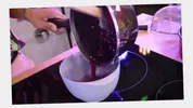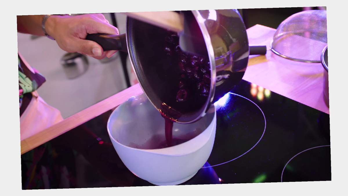 Doe de kersen voor de coulis in de pan met een scheutje water er bij. Zet de pan op een laag pitje. Laat de kersen langzaam ontdooien, roer af en toe met een spatel of pannenlikker. Als de kersen zacht en warm zijn kun je ze gaan pureren. Doe ze in een kommetje en gebruik hiervoor de staafmixer. Pas op voor spetteren! Doe de gepureerde kersen door een zeefje terug in de pan en laat het nog zachtjes doorkoken. Als de coulis wat dikker is geworden, kun je het van het vuur afhalen. Laat de coulis even afkoelen.