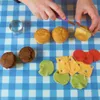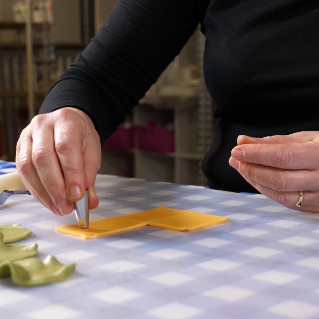 Voor deze hamburgercakes maak je het beleg van fondant. Pak een stuk groene fondant en rol dit uit tot het mooi dun is. Gebruik een uitsteekvormpje om drie rondjes uit het fondant te halen. Pak de rondjes en kneed de randjes lichtjes, totdat ze er uit zien als slablaadjes. Leg je ‘slablaadjes’ aan de kant en rol de gele fondant uit. Gebruik het mesje of het spateltje om vier rechthoekjes uit de fondant te snijden. Pak dan de spuitkop en druk hiermee kleine rondjes uit de fondant, zodat je fondant-rechthoekjes op gatenkaas lijken. Friemel de uitgedrukte rondjes uit het fondant met het mesje en leg je plakjes ‘kaas’ aan de kant.