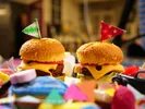 Nu je alle ingrediënten hebt, kan je je hamburger in elkaar zetten. Een goede hamburger heeft onderop sla, daarop de burger, daarop de kaas en tenslotte de tomaat. Steek er een vlaggetje in om de burger helemaal af te maken. Ready to serve!