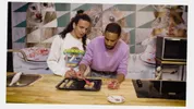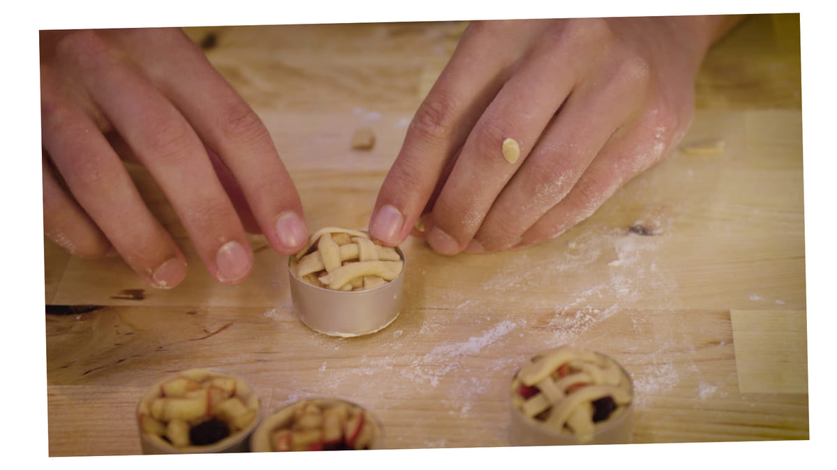 Vul de helft van de vormpjes met de baas-vulling en de andere helft met de beest-vulling. Zorg er voor dat je deeg over hebt voor de bovenkant van de appeltaart. Snij kleine, dunne reepjes uit het deeg en leg deze gekruist op elkaar op de vulling. De appeltaartjes mogen nu voor 13 tot 15 minuten in de oven!