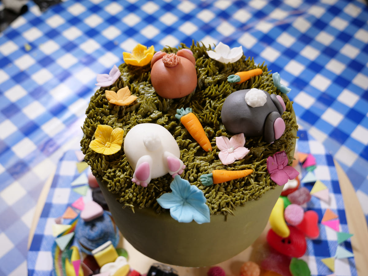 Maak deze 'Taarten van Abel'-paastaart met konijntjes op zoek naar wortels van fondant in gras van botercrème!