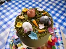 Pak de taart die je wil versieren er bij. Meng wat groene kleurstof door de botercrème en doe dit in een spuitzak. Het is belangrijk dat je een goede spuitkop hebt om ‘gras’ mee te spuiten- een spuitkop met meerdere kleine gaatjes werkt hiervoor het beste. Versier de taart met het ‘gras’. Als je klaar bent, kun je de wortels en konijntjes er op leggen. Je kan je taart ook versieren met chocoladebloemen of paaseitjes. Wat zeggen we dan?