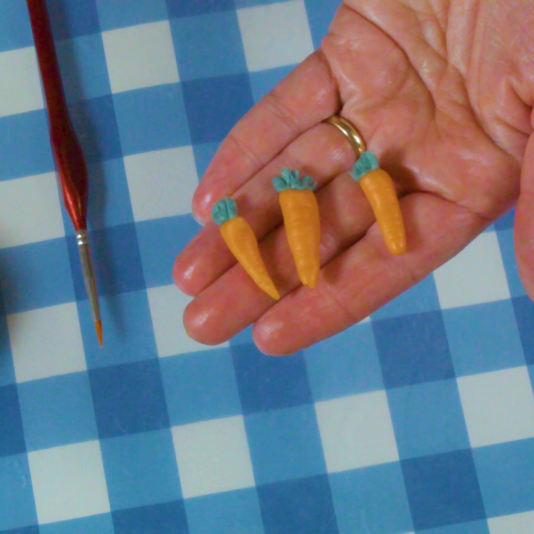 Nu is het tijd om de fondantwortels te maken. Deze zijn erg makkelijk. Rol een beetje oranje fondant uit en druk er zachtjes wat groeven in met een spateltje zodat het fondant op een wortel lijkt. Lijm er dan een stukje groene fondant op en gebruik het schaartje om het tot loof te knippen. Worteltje klaar!