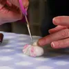 Om te beginnen, maak je de konijnenbilletjes van fondant! Rol een bolletje witte fondant. Rol dan een stukje witte fondant en snij deze doormidden. Gebruik een kwastje om wat eetbare lijm op het bolletje fondant te doen en plak de twee stukjes fondant er op. Dit zijn de voetjes. Gebruik roze fondant om de kussentjes op de voetjes te maken. Doe tenslotte een klein bolletje witte fondant op de bovenkant, dit is het staartje. Gebruik een klein schaartje om het staartje ‘pluizig’ te maken.