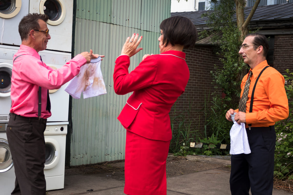 Snel worden er nieuwe roze koeken gehaald, gaat de spuitbus over het kapsel van Roos en kan de opname onder leiding van regisseur Ben van der Meyden (o.a. Koefnoen, De dokter Corrie show) verder. De scène speelt zich af in een kleine vergaderruimte en het valt op dat bij een tweede take Van Rossum en Van Oorschot van plaats zijn verwisseld. Dat lijkt een vergissing, maar is het niet. Van der Meyden: ‘Door ze andersom te zetten creëer je een prettige chaos. Dan denkt de kijker, hé daar hebben ze niet opgelet. Zo haal de je continuïteit en de beeldtaal onderuit.’