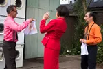 ‘Drie, twee, één, actie!’ klinkt het even later en monter stapt de sponsor op Roos af. Hij tikt op haar schouder en het effect overtreft alle verwachtingen. Ze zwaait het waterpistool in zijn richting, hij grijpt naar zijn gezicht, een bril valt op de grond, zijn pak wordt nat en hij deinst half vallend achteruit.