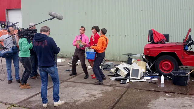 De setdresser (‘Hieraan meewerken is echt een jongensdroom’) heeft van tientallen oude computers een berg gebouwd. Die apparaten worden door Roos, die het begrip ‘opschonen’ niet helemaal heeft begrepen, met een hogedrukspuit onder handen genomen. In een regenjas en met rubber laarzen test ze het pistoolvormige apparaat. Dat ziet er direct grappig uit. De regisseur glimlacht. De bedoeling is dat ze tijdens het schoonspuiten door de sponsor in zijn mooie pak op haar schouder wordt getikt. Voordat hij iets kan zeggen krijgt hij de volle laag. Klinkt simpel, maar humor hoort tot de moeilijkste genres op televisie.