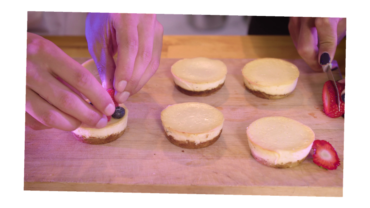 Haal de cheesecakes uit de oven. Snij ze voorzichtig los en haal ze uit de bakvorm. Versier de cheesecakes met het fruit. Say cheeeeeeese(cake)! Enjoy!