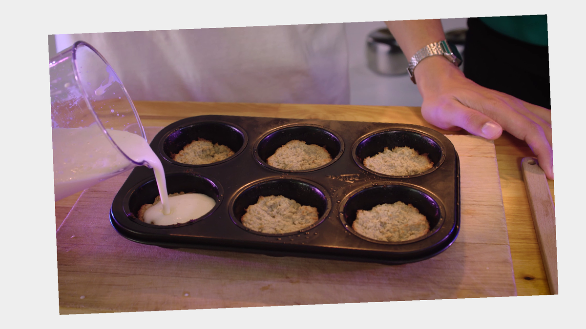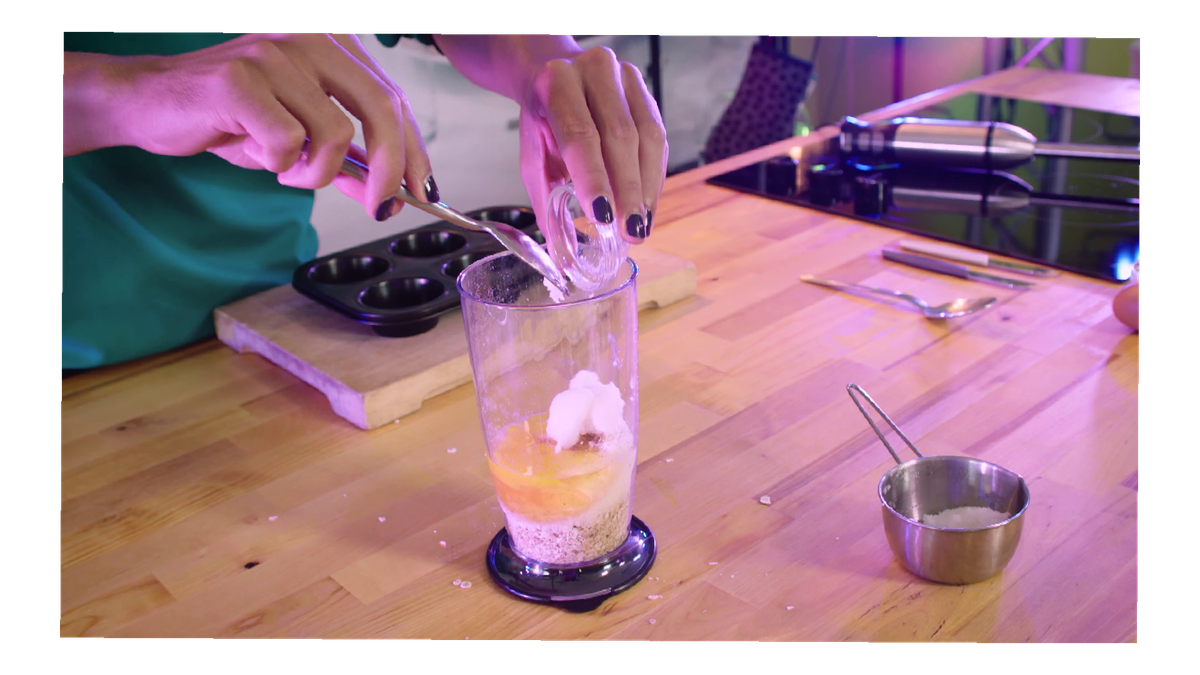 Verwarm de oven voor op 180º. Eerst maak je de bodem van de cheesecake. Alle ingrediënten voor de bodem (havermout, kokosrasp, kokosvet, ei, honing en kaneel) mogen gewoon lekker bij elkaar. Mix dit mengsel met een staafmixer. Roer het mengsel tussendoor, zodat alles goed met elkaar mengt. Gebruik wat extra kokosvet om een bakvormpje in te vetten. Maak zes kleine bodempjes in de bakvorm. Doe de bodempjes acht minuten lang in de oven. Haal ze na acht minuten uit de oven en laat ze even rusten. Zet de oven alvast op 120º, voor de vulling zometeen.