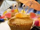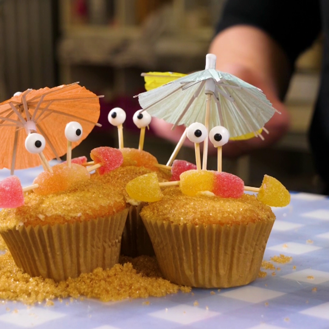 Gebruik een beetje botercrème om de snoepoogjes aan de bovenste twee prikkers te 'lijmen'. Gebruik opnieuw wat crème om het krabje op het strand te plakken. Steek je parasol in het zand en geniet van het strand!