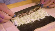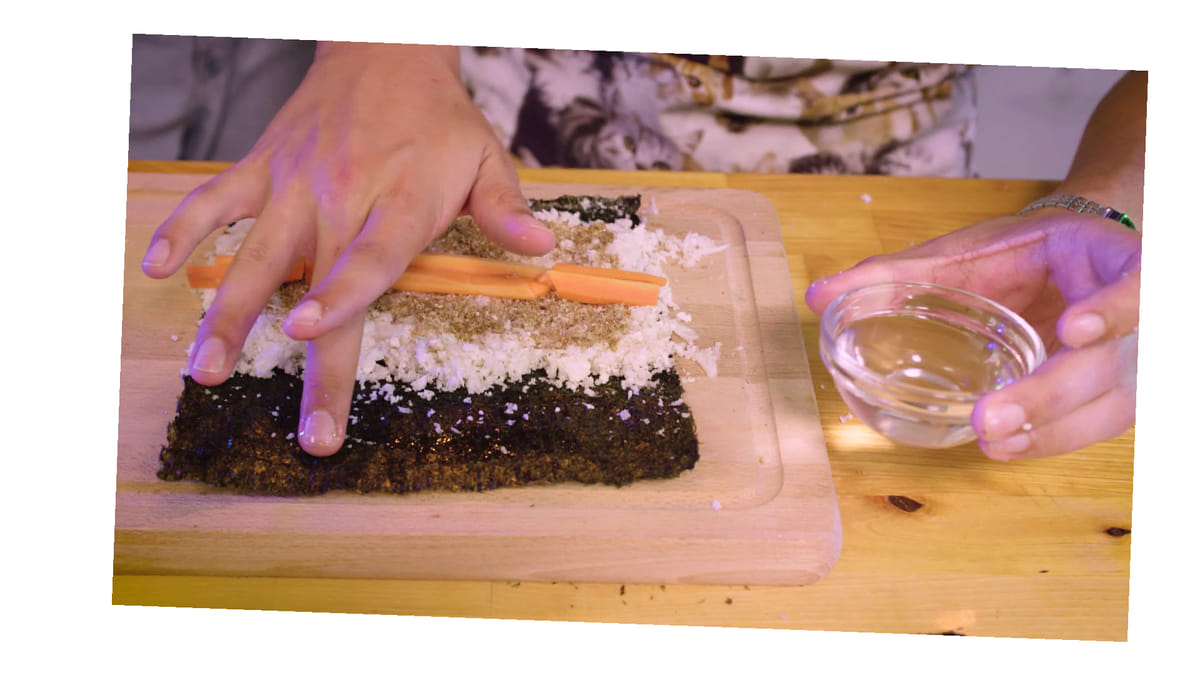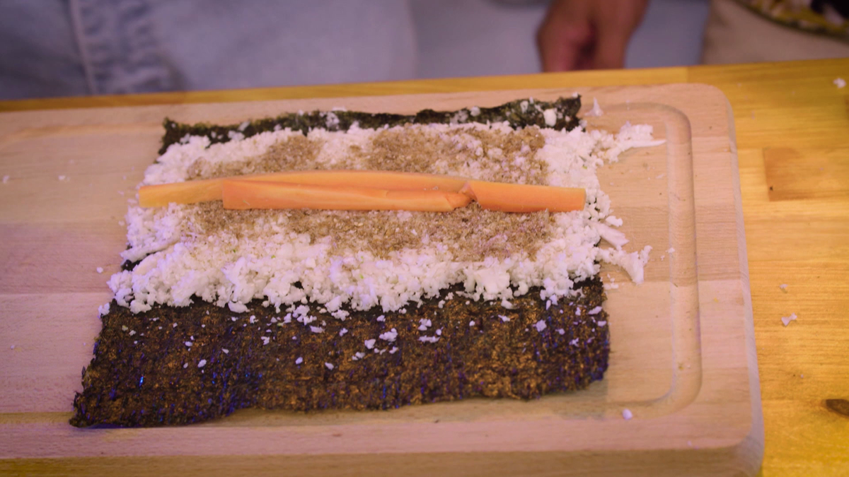 It’s rolling time! Leg een zeewier vel neer en bestrijk deze met een laagje geblende bloemkool. Zorg er voor dat aan beide kanten van het sushi-vel ruimte over is: ongeveer 3 cm aan de ene kant en een vingerbreed aan de andere kant. Strooi de meelwormvijzel over het bloemkoollaagje en leg hier wat reepjes wortel bovenop. Dip je vinger in een schaaltje water en bestrijk de onbedekte stukjes sushivel met je natte vinger. Hierdoor blijft de sushirol plakken als je hem oprolt.