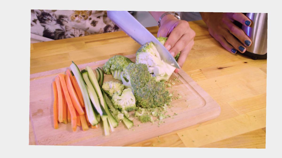 Begin met de komkommer. Snij deze even lang als het sushivel breed is. Snij daarna de komkommer in de lengte in reepjes en verwijder de zaadlijsten. Deze kun je lekker snacken tijdens het koken! Snij het kopje en kontje van de wortel er af. Snij daarna de wortel ook in dunne reepjes. Snij de broccoli in stukjes en blend! Doe hetzelfde met de bloemkool. Vijzel de meelwormen tot ze fijn zijn.