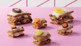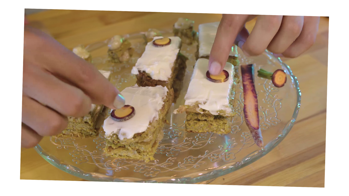 Snij de rest van de cake in kleine stukjes voor het baasje en in hele kleine stukjes voor het beest. Smeer de geprakte banaan op een cakeplakje en leg er een tweede cakeplakje op. Doe opnieuw wat geprakte banaan op het tweede plakje en druk dit aan met een derde plakje. Versier de bovenkant van de cakejes voor het beest met stukjes gekleurde wortel. Gebruik voor het derde plakje cake voor de baasjes de cake met glazuur er op uit de koelkast. Versier dit ook met stukjes wortel. Carrotastic!
