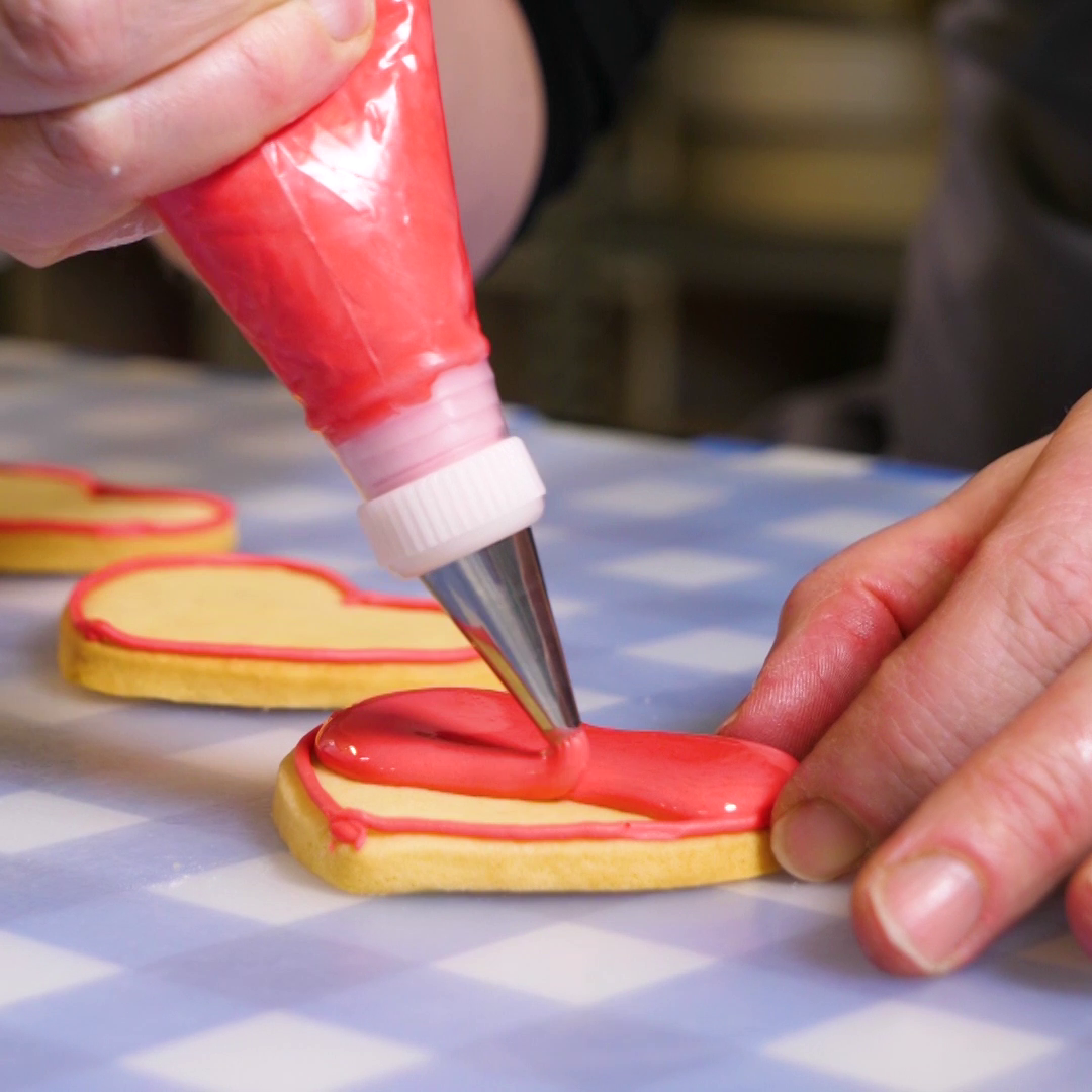 Voor deze koekjes gebruiken we een royal icing mix. Dat is de makkelijkste manier om een mooi glazuur te maken voor je koekjes. Doe 450 gram van de mix samen met 55 ml water in een kom en meng dit met een keukenmachine, voor een paar minuten. Als je pieken kan trekken die niet teruglopen is de icing goed! Leg twee eetlepels icing terzijde om later te gebruiken. Meng door de rest van de icing een paar druppels rode kleurstof. Doe de rode icing in een spuitzak met een smalle spuitkop en maak een mooie rand van icing op de koekjes. Laat tien minuten drogen.