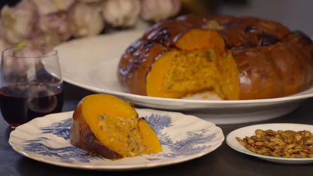 Dien de pompoen in z’n geheel op. Geef er lekker veel groene groenten bij of sla.