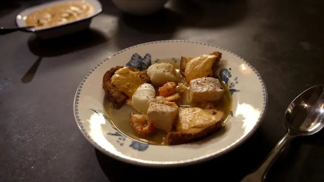 Laat alles even doorwarmen en de vis garen en dien gelijk op met rouille en croutons erbij. Schep eerst de vis in het bord en giet dan de bisque erbij.