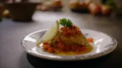 Schep er de tomatenrelish over en dien op met knapperig brood erbij.