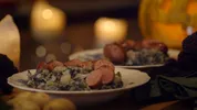 Schep de kool door de puree en breng de stamppot op smaak met nootmuskaat, peper en zout.