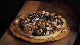 Schep een paar keer om tot het blad goed kan slinken. Bak even op hoog vuur zodat het vocht verdwijnt. Besmeer de farinata royaal met humus en / of kaas zoals blauwe kaas, feta, geitenkaas en beleg hem met de spinazie. Bestrooi met nog wat geraspte feta of andere kaas. En eventueel ook met geroosterde kekers.