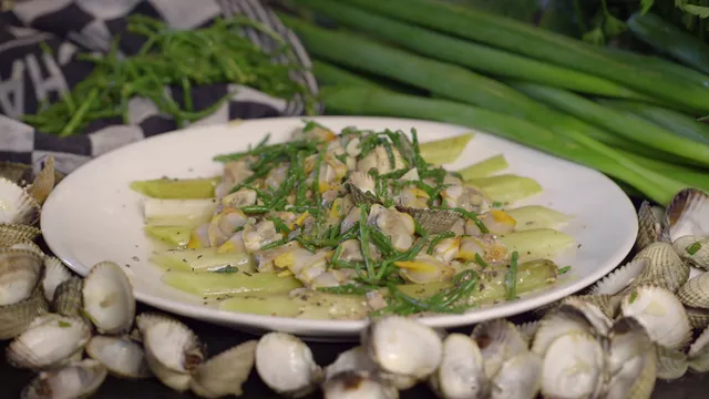 Na een paar minuten moeten de schelpen open zijn. Bestrooi met grof gehakte zeekraal schep om.
