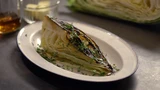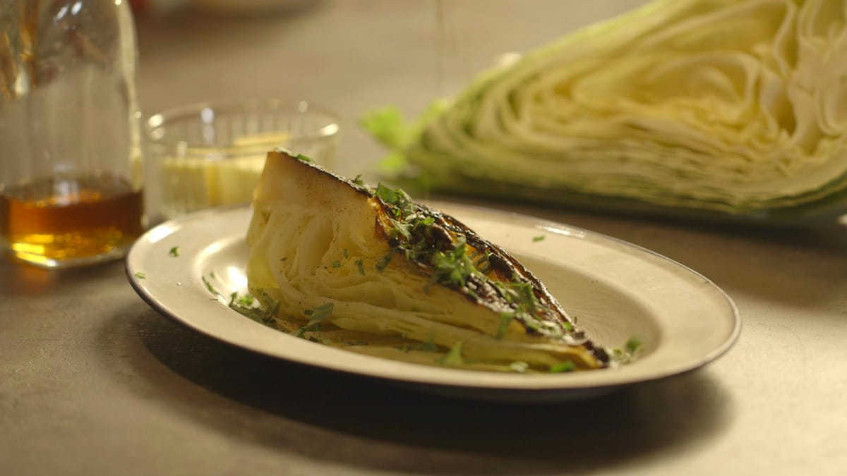 Verhit de olie in een middelgrote, liefst gietijzeren- of zwaar stalen koekenpan op middelhoog vuur en leg de gehalveerde kool met de gesneden kant naar onder in de pan. Bak hem, zonder aan te raken, 10-15 minuten, tot de onderkant mooi geblakerd is. Draai het vuur dan ietsje lager, voeg de helft van de boter toe en schud de pan om de boter rondom en onder de kool te krijgen. Wanneer de boter gesmolten is en schuimt, til dan de koekenpan naar u toe en schep de boter over de kool. Zorg dat het overal komt. Doe dit een halve minuut achter elkaar. Laat de kool nu 3 minuten verder bakken en herhaal de handeling dan minstens twee keer opnieuw. Als de boter in de pan te bruin wordt, voegt u opnieuw een klontje boter toe. Prik met een breinaald of stalen satéprikker in de kern van de kool: is hij al gaar? De pen moet er moeiteloos doorheen gaan. Is dat niet het geval, laat de kool dan nog even doorgaren. Blus de pan af met de garum of vissaus. Besprenkel de kool met appelazijn, proef op zout en peper, bestrooi met de dragon en dien op.