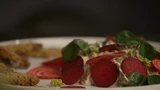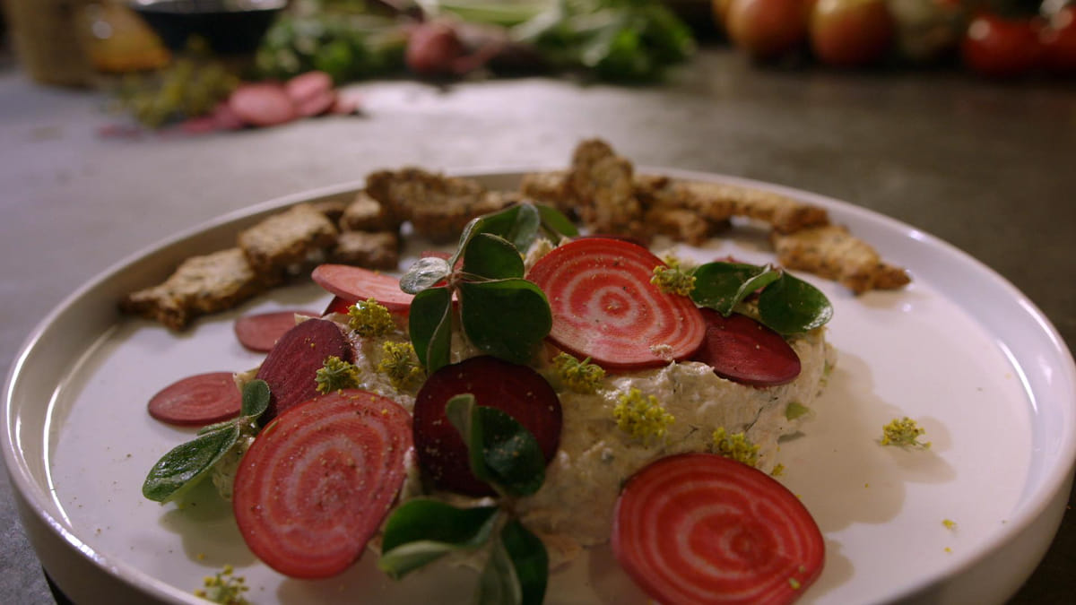 Snij de bleekselderij heel erg klein. Doe de ingemaakte citroen, de rest van de dragon en de bleekselderij en bronzen venkel of dille bij de mousse in een grote kom. Meng kort. Breng op smaak met de rest van het citroensap en wat zout en peper. Bestrooi met (gerookt) paprikapoeder en schijfjes rauwe biet en nog wat mooie tuinkruiden Geef er de oatmelacakes / havermout-toastjes bij.