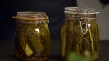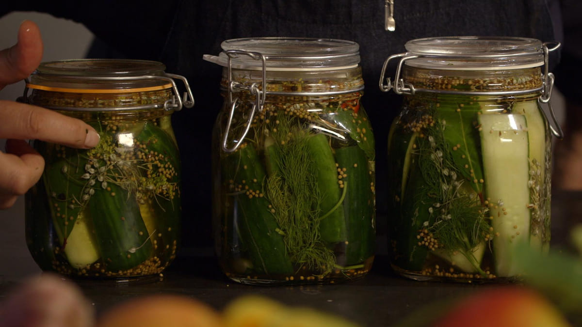 Bestrooi ze ruim met zout. Zet ze 12 uur koel weg, maar een uur mag ook, worden ze iets minder stevig. Was ze daarna heel goed. Het zoutbad was nodig om de schil wat steviger te maken, het vruchtvlees mooi stevig en goed op smaak. Snijd de komkommers daarna op de maat van de pot, zodat ze goed passen en duw ze er in. Schuif de takjes dille ertussen. Breng de azijn, het water, de suiker en alle andere kruiden aan de kook. Laat het 10 minuten inkoken en overgiet de komkommers in de weckpot met de vloeistof. Sluit het deksel.